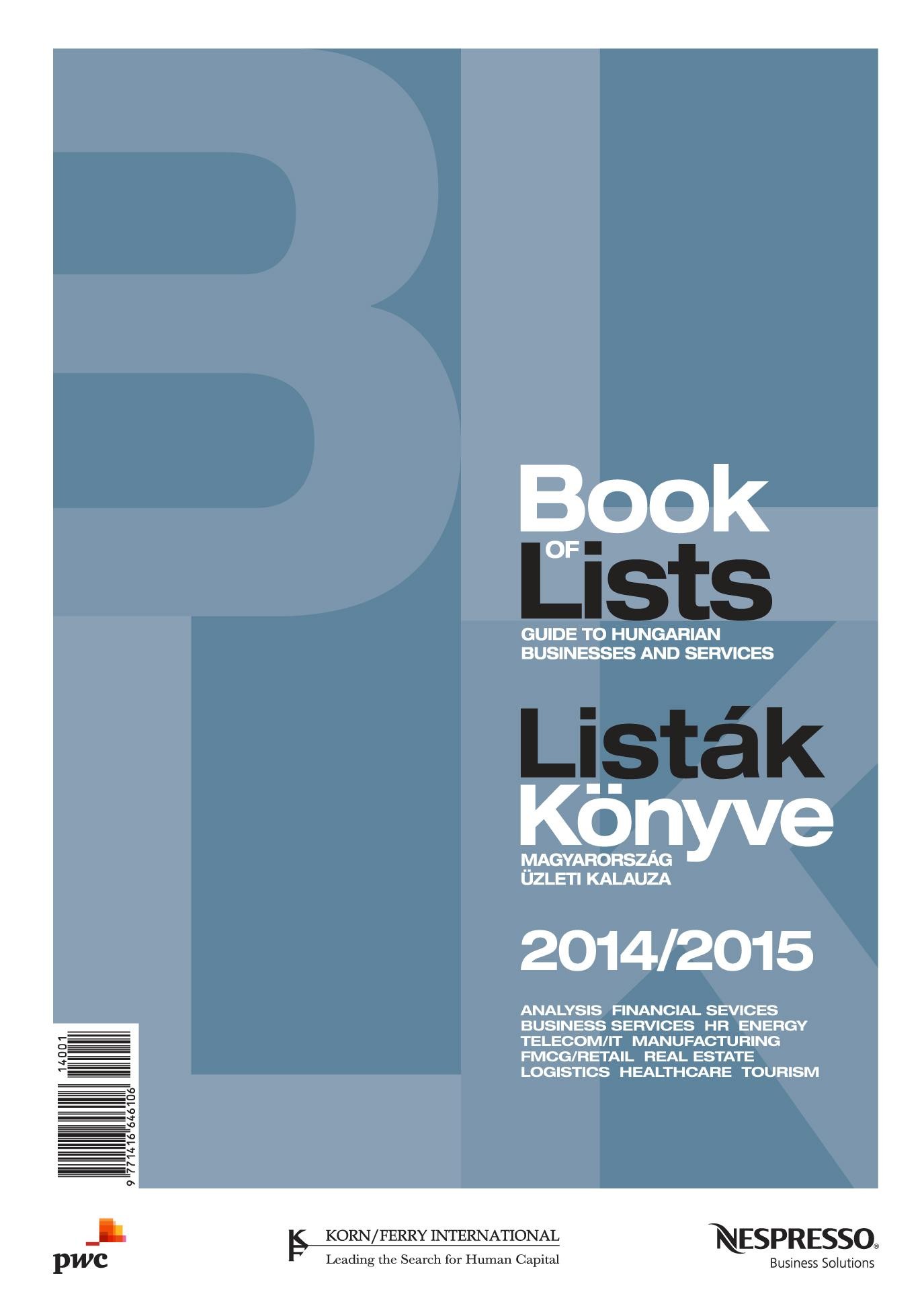 A Listák Könyve évente megjelenő, Magyarország egyedülálló üzleti és iparági kalauza, évről évre alapos és átfogó információs gyűjteményként szolgál. Két évtized alatt rivális nélküli márkanévvé nőtte ki magát. A könnyen áttekinthető kiadvány 100 ágazat mintegy 2500 legnagyobb cégének adatait gyűjti össze, a cégek meghatározó üzleti számainak alapján rangsorolva. A kiadványban megtalálható a cégek elérhetőségeit, vezetőinek adatait, tulajdonosi szerkezetet stb. A listák sora évről évre megújul és bővül. A könyv az értékes adatokon túl főbb iparágakra vonatkozó átfogó elemzéséket is közöl, gyakorlati segítséget nyújtva a szakembereknek.